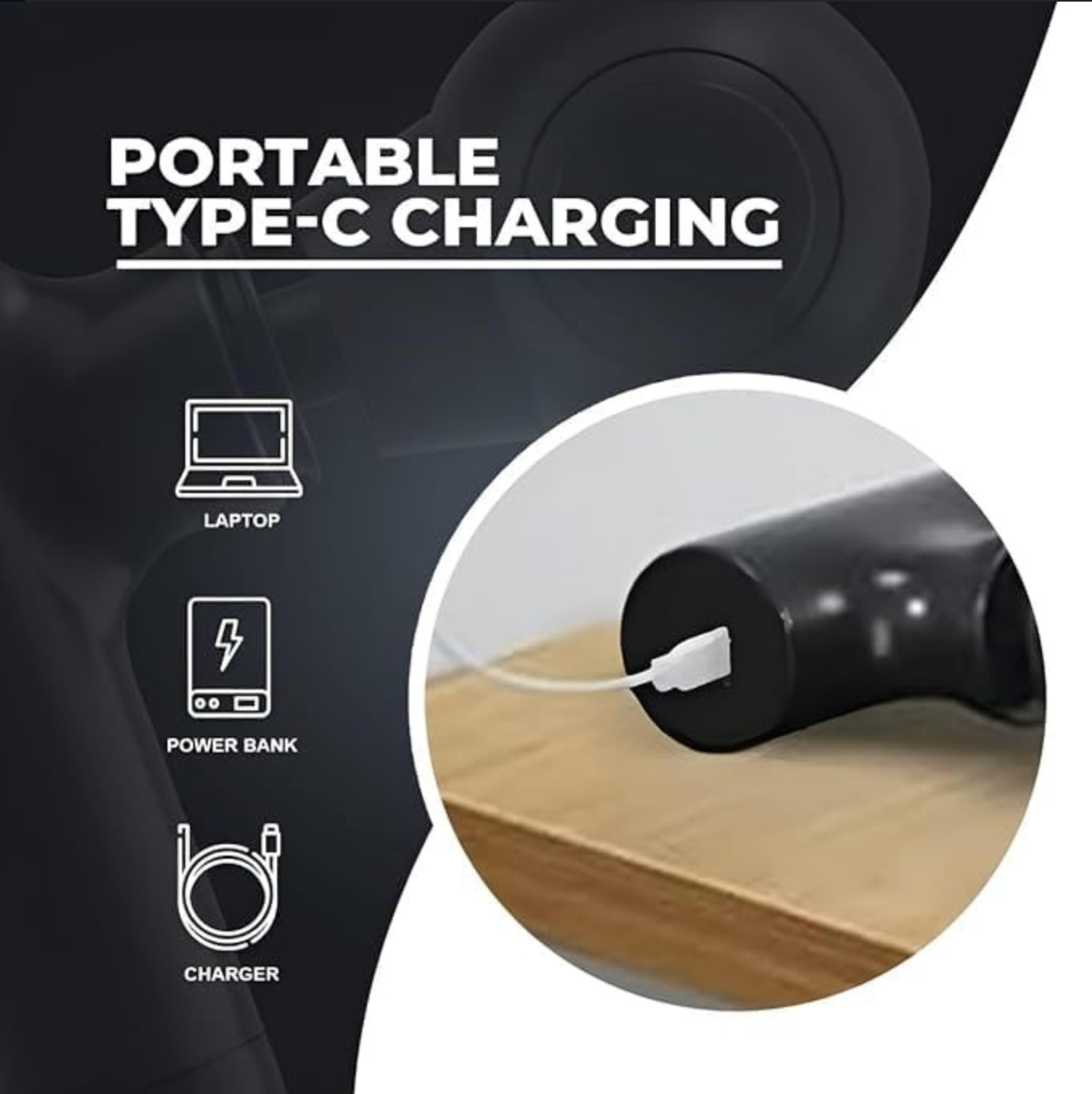 - Cordless & Rechargeable – Powered by a long-lasting lithium-ion battery, this portable massage gun is completely cordless for convenience. Comes with an AC-DC power adapter for easy recharging anytime, making it perfect for home, office, gym, or travel use.