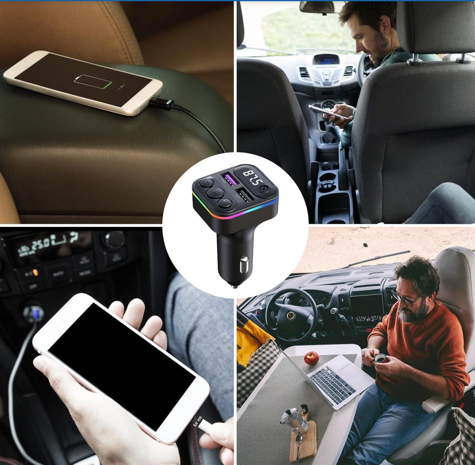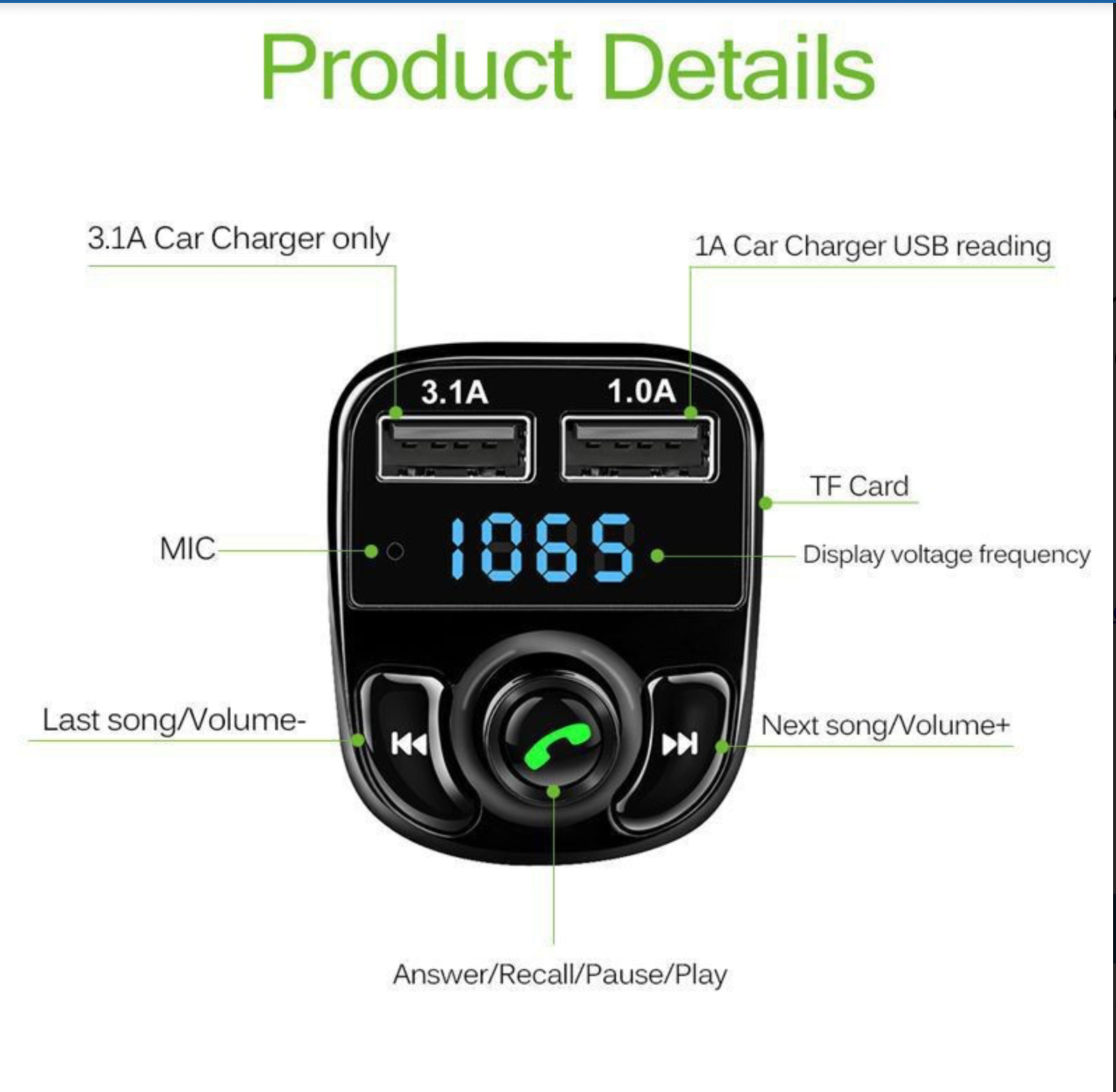- ❧Enhanced Charging: By using advanced technology, this FM transmitter for car comes with dual USB ports for fast charging. With 3.1A output, you can quickly charge two devices at once, providing a worry-free driving experience.